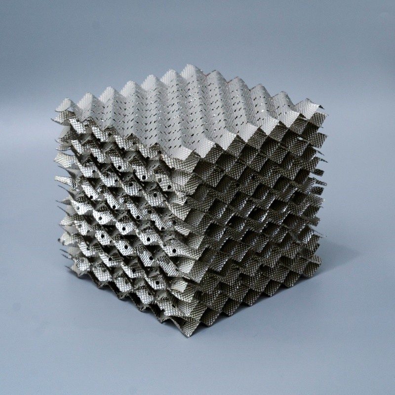 The corrugated plate of the packing is punched with many small holes about f5mm, which can coarsely distribute the liquid on the plate and strengthen the horizontal mixing. The corrugated plates are rolled into small grooves, which can finely distribute the liquid on the plates and enhance the surface wetting performance. The metal orifice corrugated packing has high strength and strong corrosion resistance, which is especially suitable for large diameter towers and occasions with heavy gas and liquid loads.